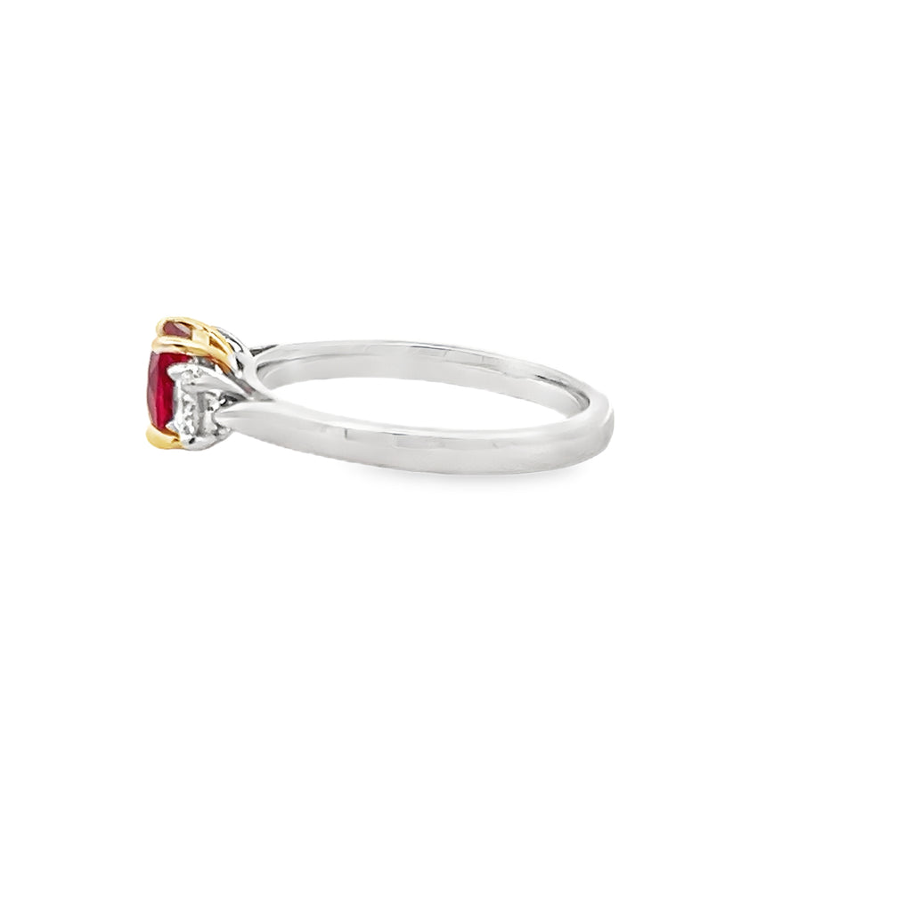 Set in a Timeless Trilogy Mount of 18ct Yellow Gold and Platinum, the Ruby is Flanked by 0.35ct of Round Brilliant Cut Diamonds, Adding Classic Sparkle and Balance.