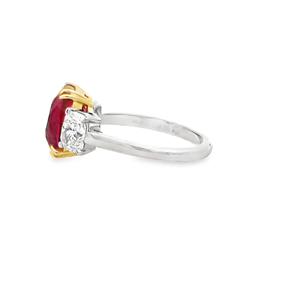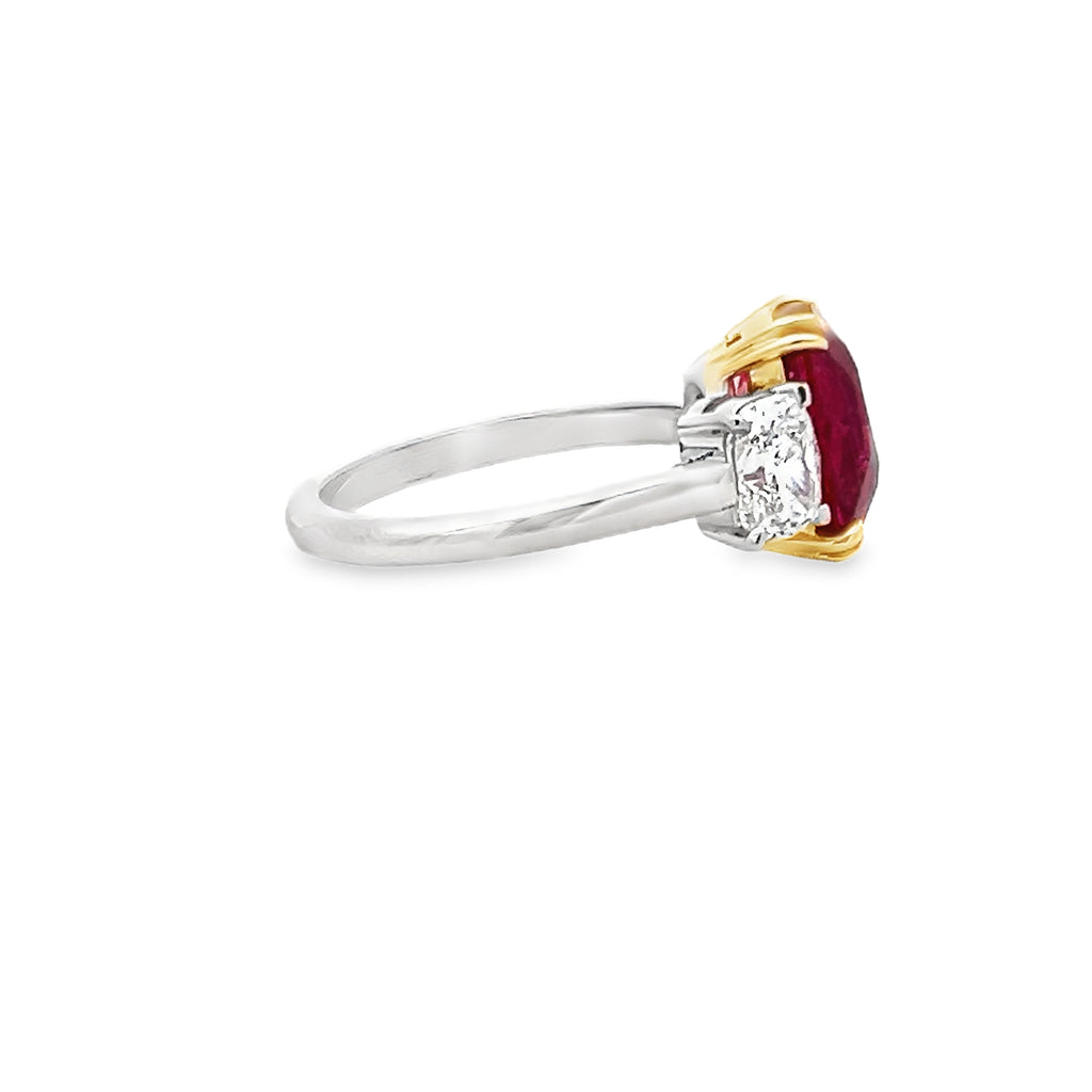 18ct Yellow Gold & Platinum, Cushion Cut Ruby, Trilogy Ring, 4.06ct, No Heat