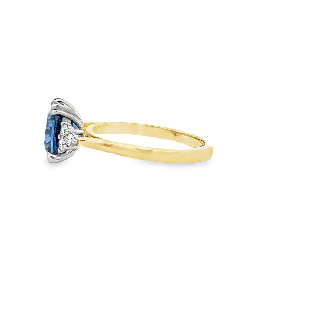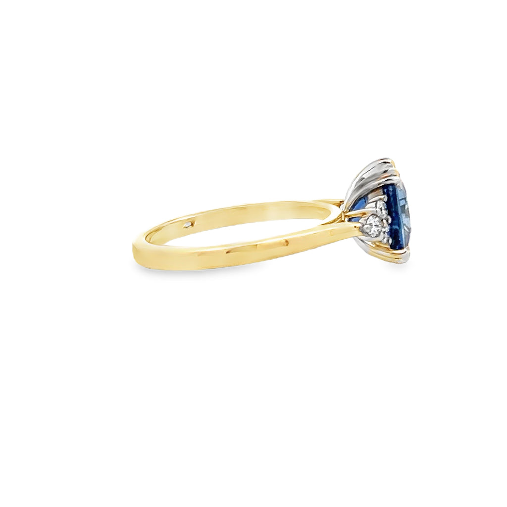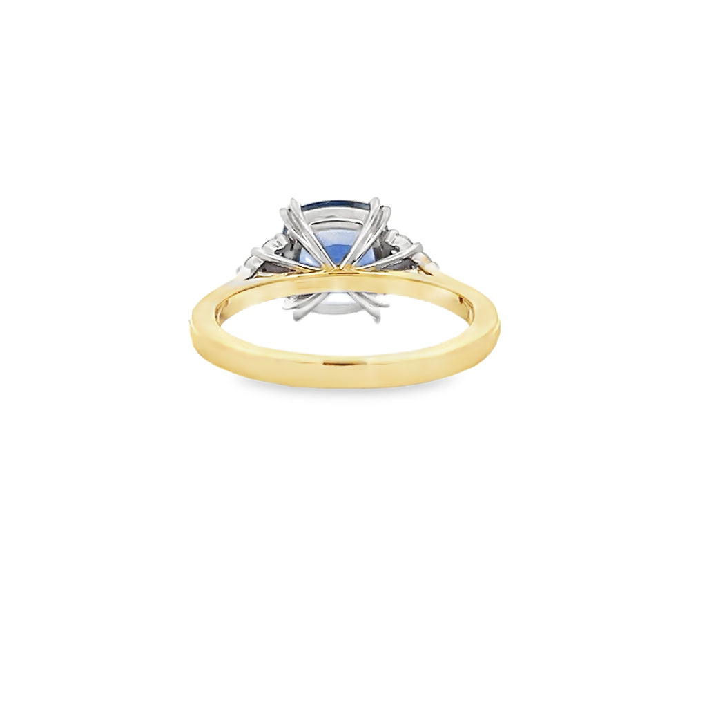 18ct Yellow Gold & Platinum, Cushion Cut Blue Sapphire, Tri-Foil Shoulder Ring, 2.97ct