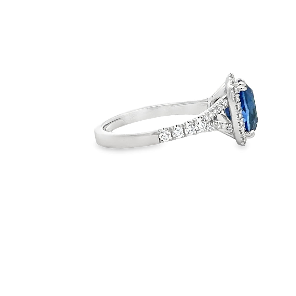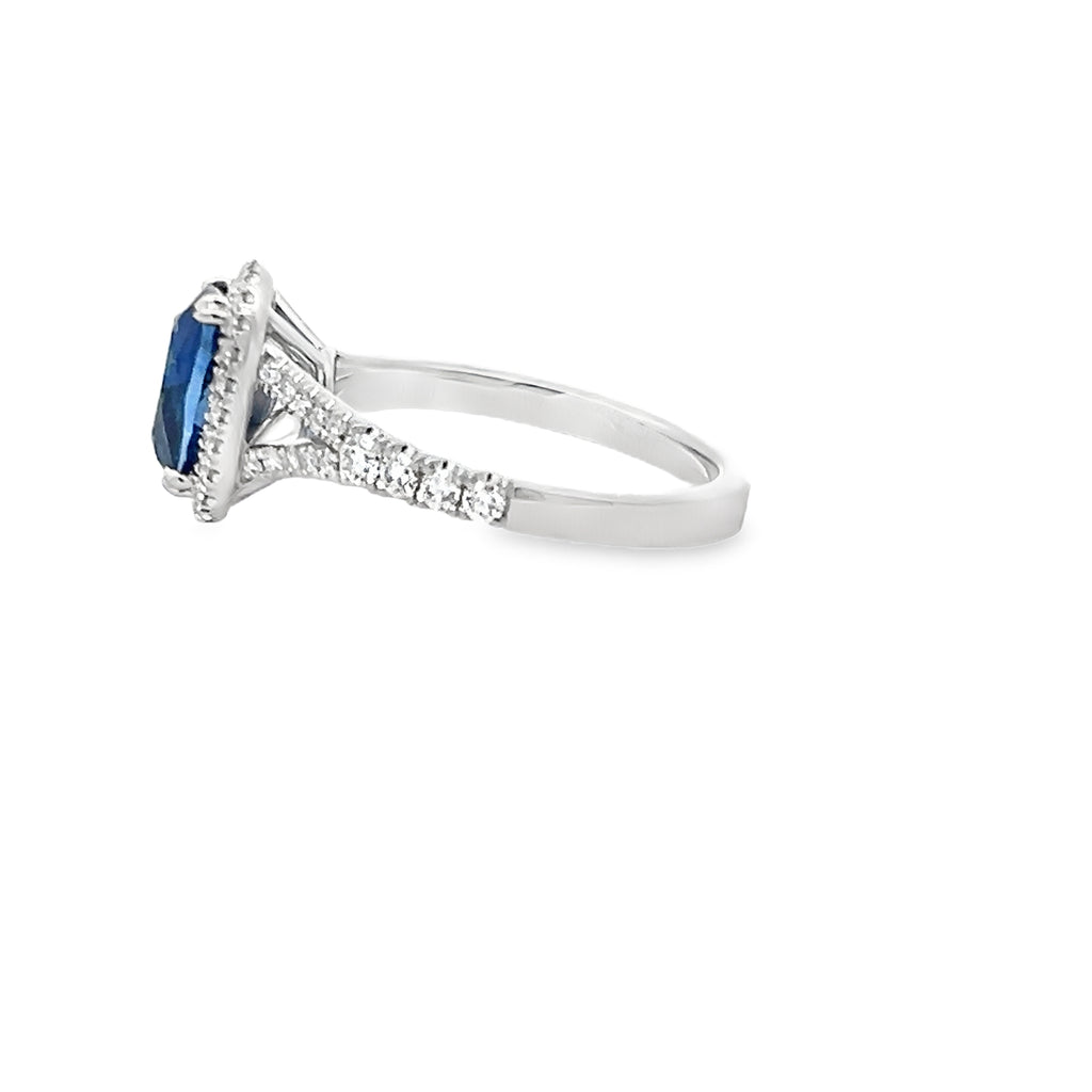 Platinum, Cushion Cut Blue Sapphire, Micro Set Split Shoulder Ring, 2.46ct