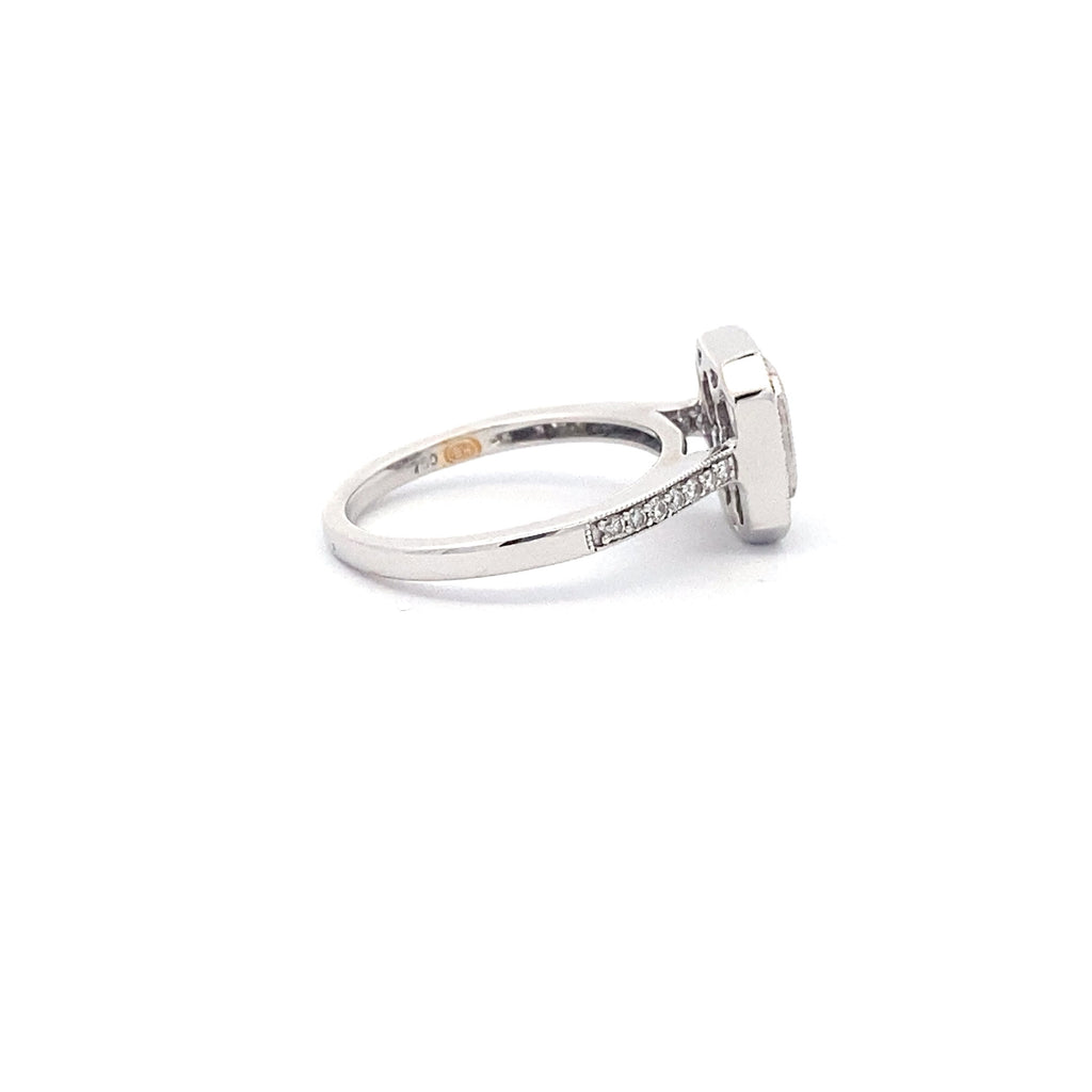 A Distinctive 0.65ct Emerald Cut Ruby, Set in a Legacy-Inspired 18ct White Gold Mount with Rubover and Grain Set Detailing.