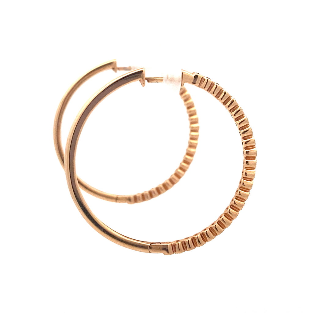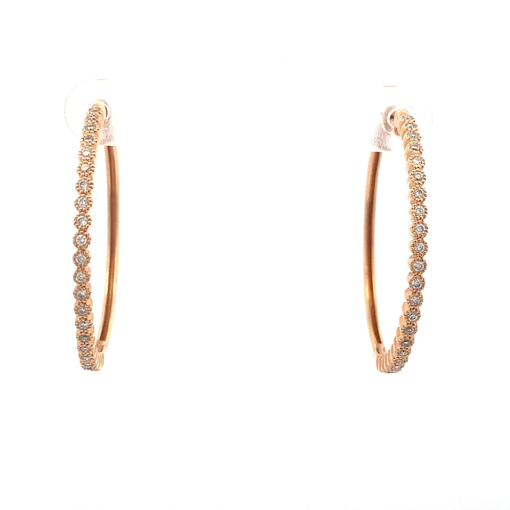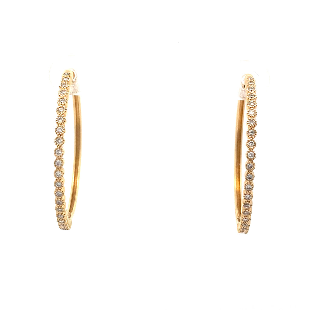 A Vintage Style Pair of Diamond Hoop Earrings set with Round Brilliant Cut Diamonds in a Rub-over Style Setting, with Added Mil-grain to Give it that Vintage Look.