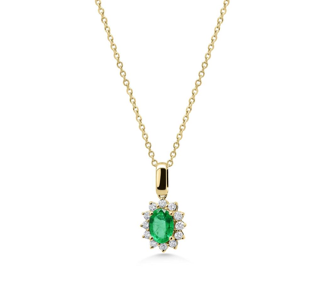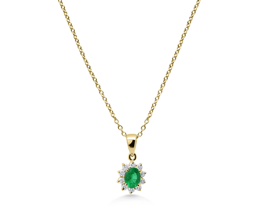 A Beautiful Emerald Cluster Pendant. Set with a Beautiful Oval Cut Natural Emerald Surrounded by a Cluster of Stunning Round Brilliant Cut Diamonds. A Timeless Classic in the Modern Day.