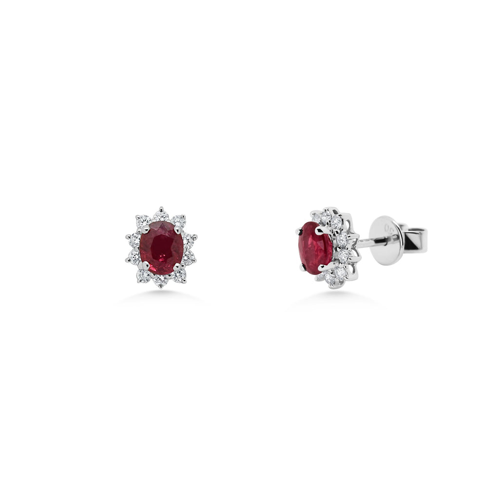 A Timeless Pair of Ruby Cluster Earrings. Set with Beautiful Oval Cut Natural Rubies Surrounded by a Cluster of Stunning Round Brilliant Cut Diamonds. A Traditional Style Which has Stood the Test of Time.