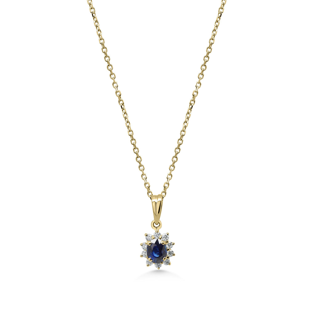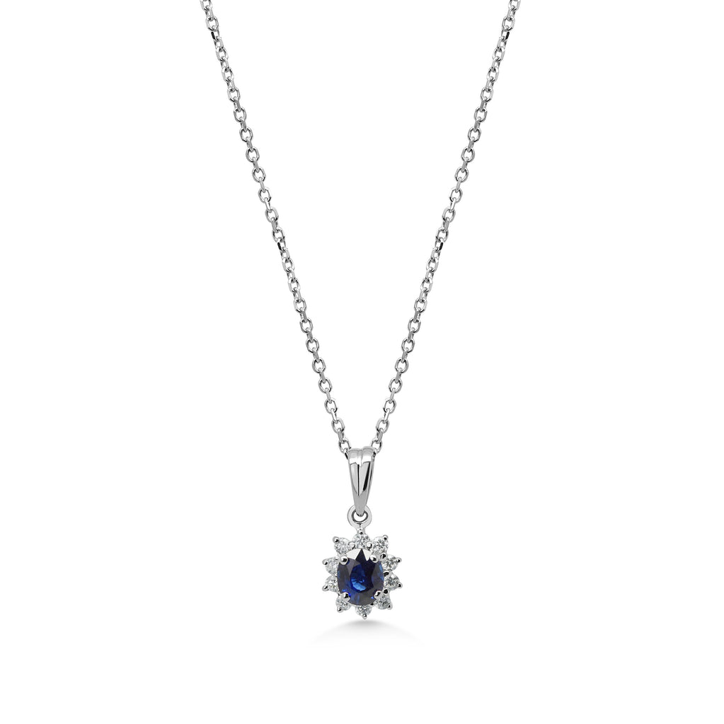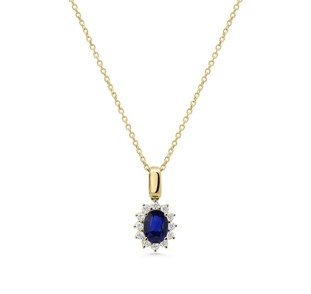 A Beautiful Sapphire Cluster Pendant. Set with a Beautiful Oval Cut Natural Sapphire Surrounded by a Cluster of Stunning Round Brilliant Cut Diamonds. A Timeless Classic in the Modern Day.
