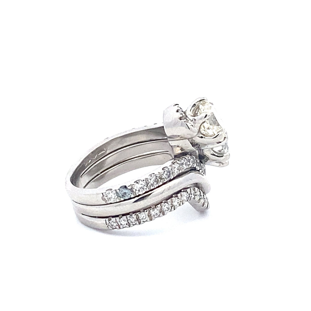 This Beautiful Round Brilliant Diamond 1.00ct E SI1, accompanied with a GIA Certificate, has set in this Elaborate Two Stone Design, with the Total Carat Weight of the Remaining Diamonds being 1.85ct. This Shape is Renowned for its Unrivalled Fire and Brilliance.