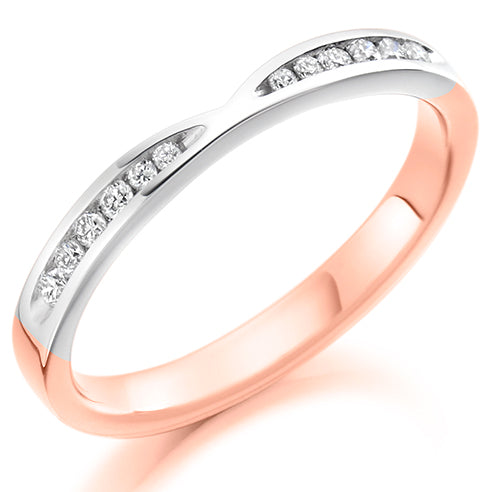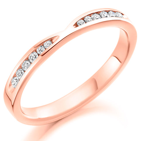 This Ring consists of Round Brilliant Cut Diamonds set in a Band under a Lip of Metal leaving a Border around the Ring. The subtle contour shape with a Pinched style makes it an ideal match for engagement rings. This Stunning Setting Style is a great Match for Those looking for a more Subtle Look.