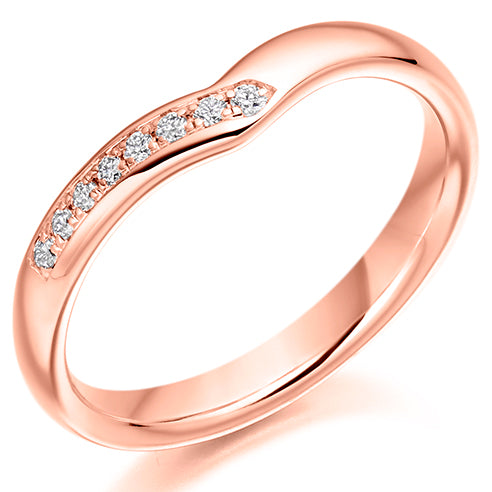This Ring consists of Round Brilliant Cut Diamonds set in a Band under a Lip of Metal leaving a Border around the Ring. The subtle contour shape makes it an ideal match for engagement rings. This Stunning Setting Style is a great Match for Those looking for a more Subtle Look.