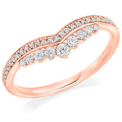 This Ring consists of Round Brilliant Cut Diamonds, each held by tiny diamond prongs or beads that are set flush into the band for comfort. The diamonds are beautifully arranged in a graceful tiara formation, creating a delicate crown-like effect that enhances its elegance. The subtle contour shape makes it an ideal match for engagement rings. This stunning setting style is a great match for those looking for a more subtle look.